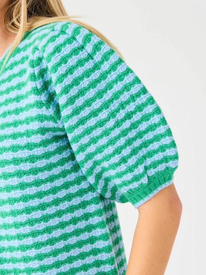 Make a statement in cozy color with this eye-catching striped sweater. Crafted in a soft knit, it features green and blue stripes that create a playful, modern look.