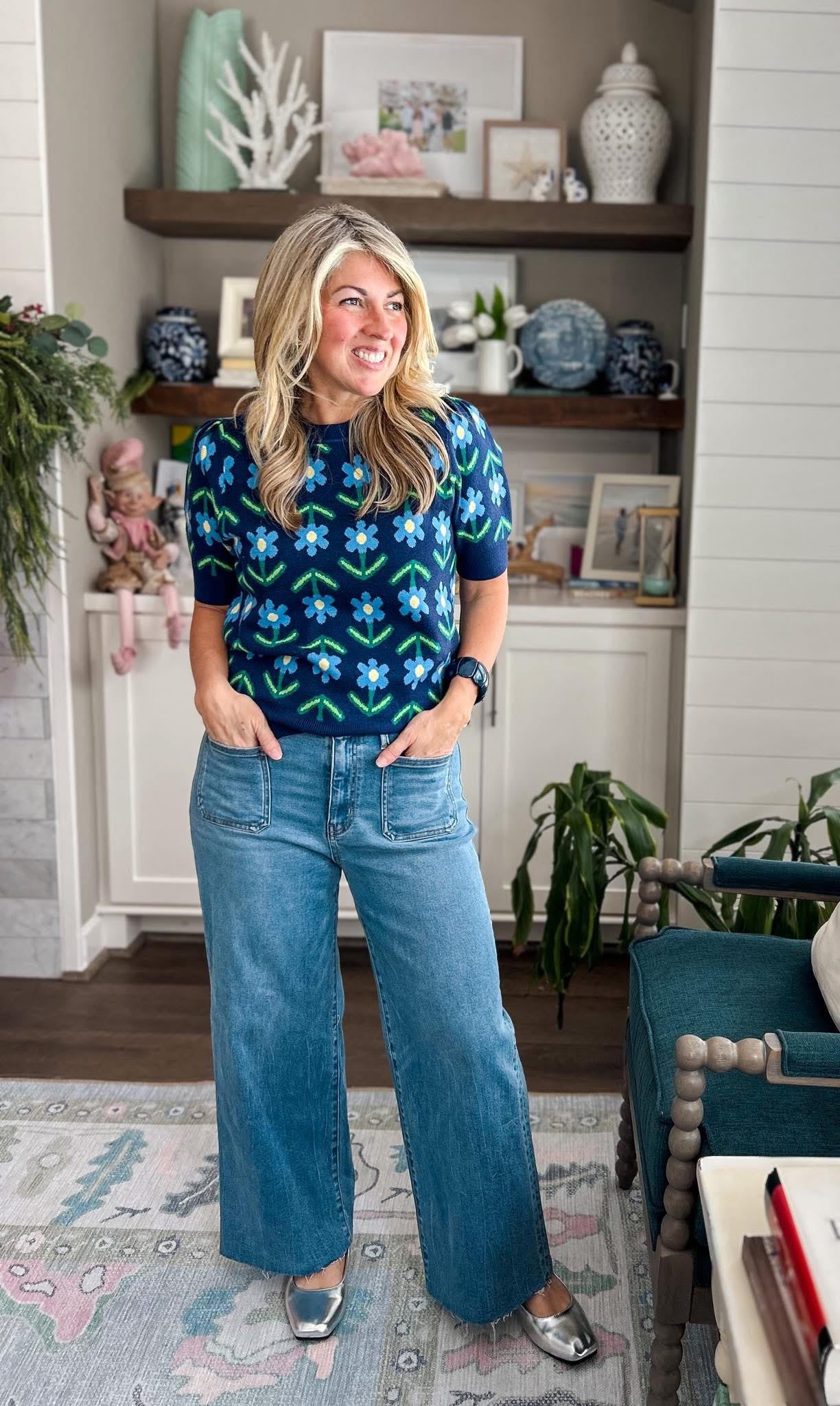 Bring a pop of playful charm to your wardrobe with this navy knit sweater top featuring an allover retro-inspired floral pattern. Easily transition from season to season with the soft blue floral pops, made from a comfortable, medium-weight knit. Perfect with denim for a casual day out or paired with tailored trousers for a polished look.
