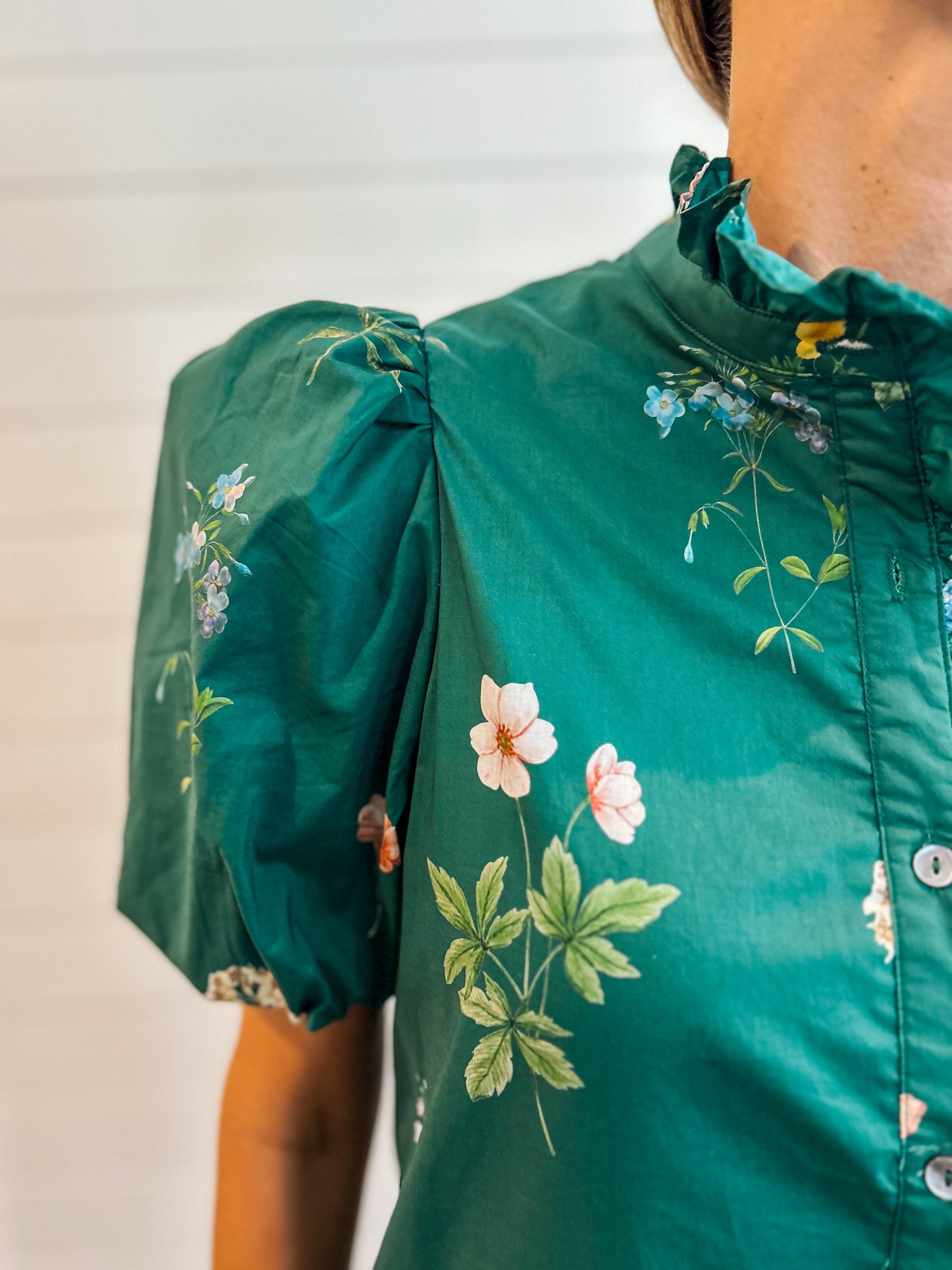 A beautiful emerald green, ruffle collar and of course pockets! A fall favorite.